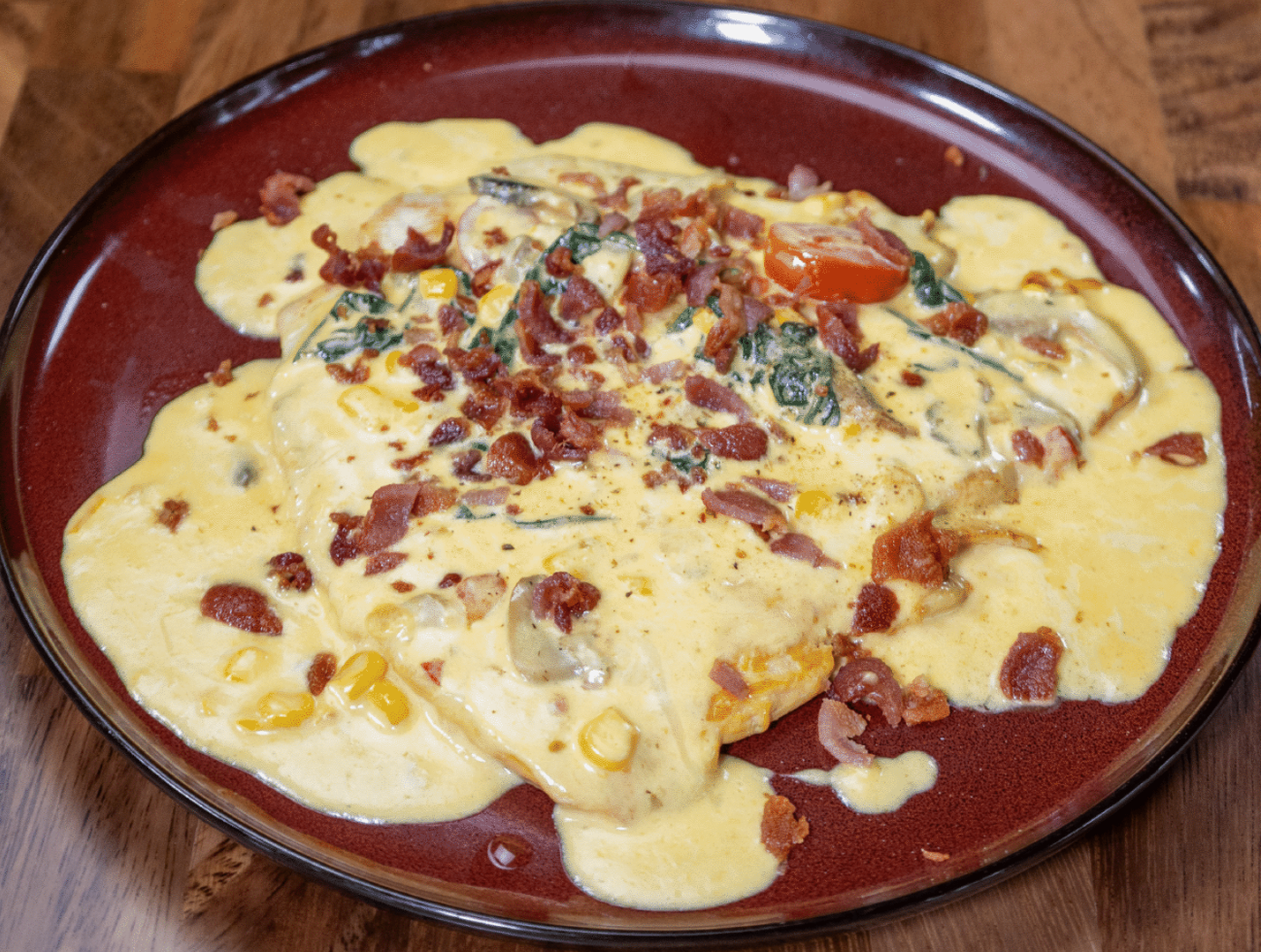 Served in a sauce with mushrooms, bacon and corn, with rice, green plantains and salad