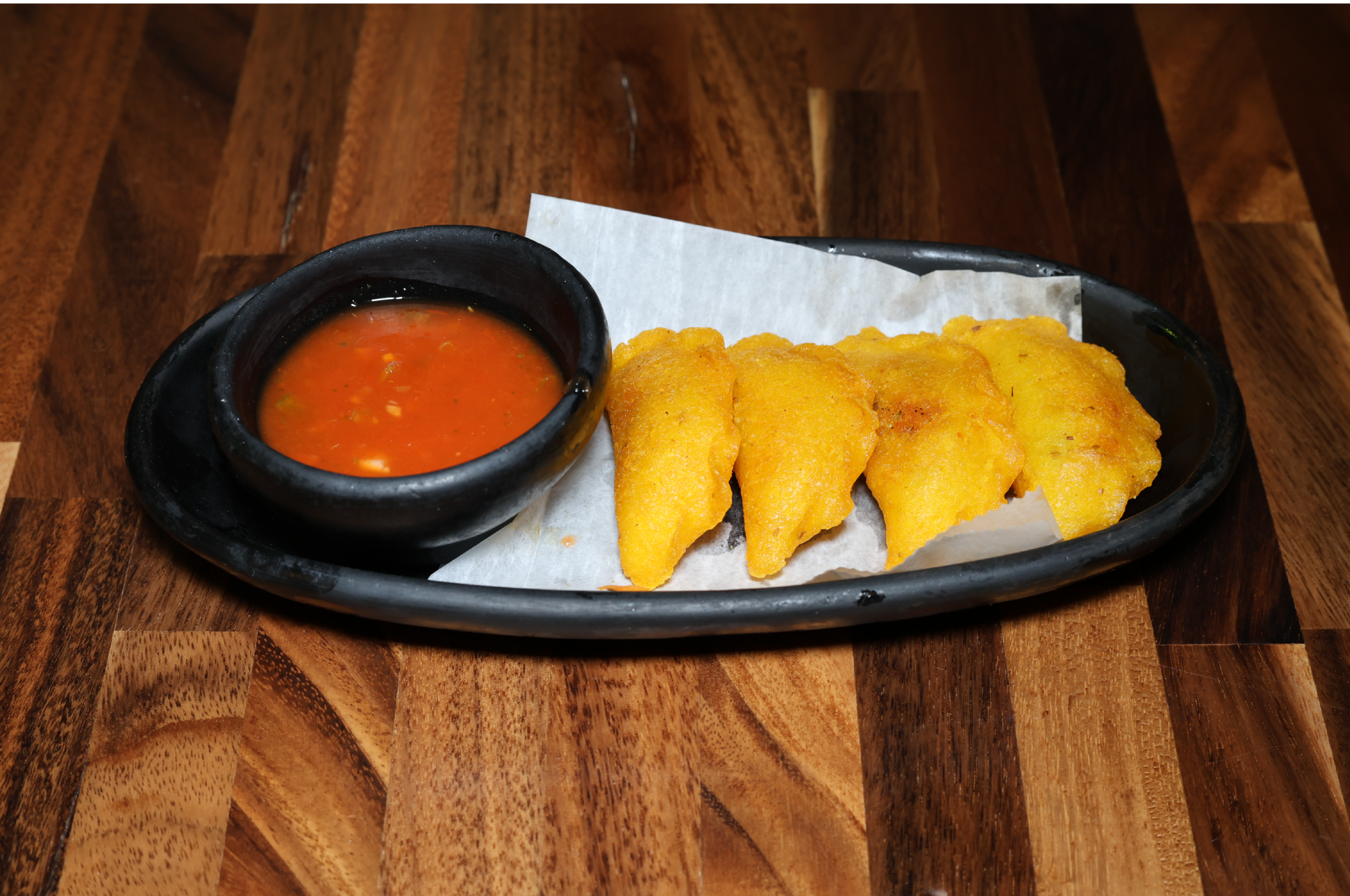 Fried green plantains, tomatoes and onions sauce & fresh guacamole