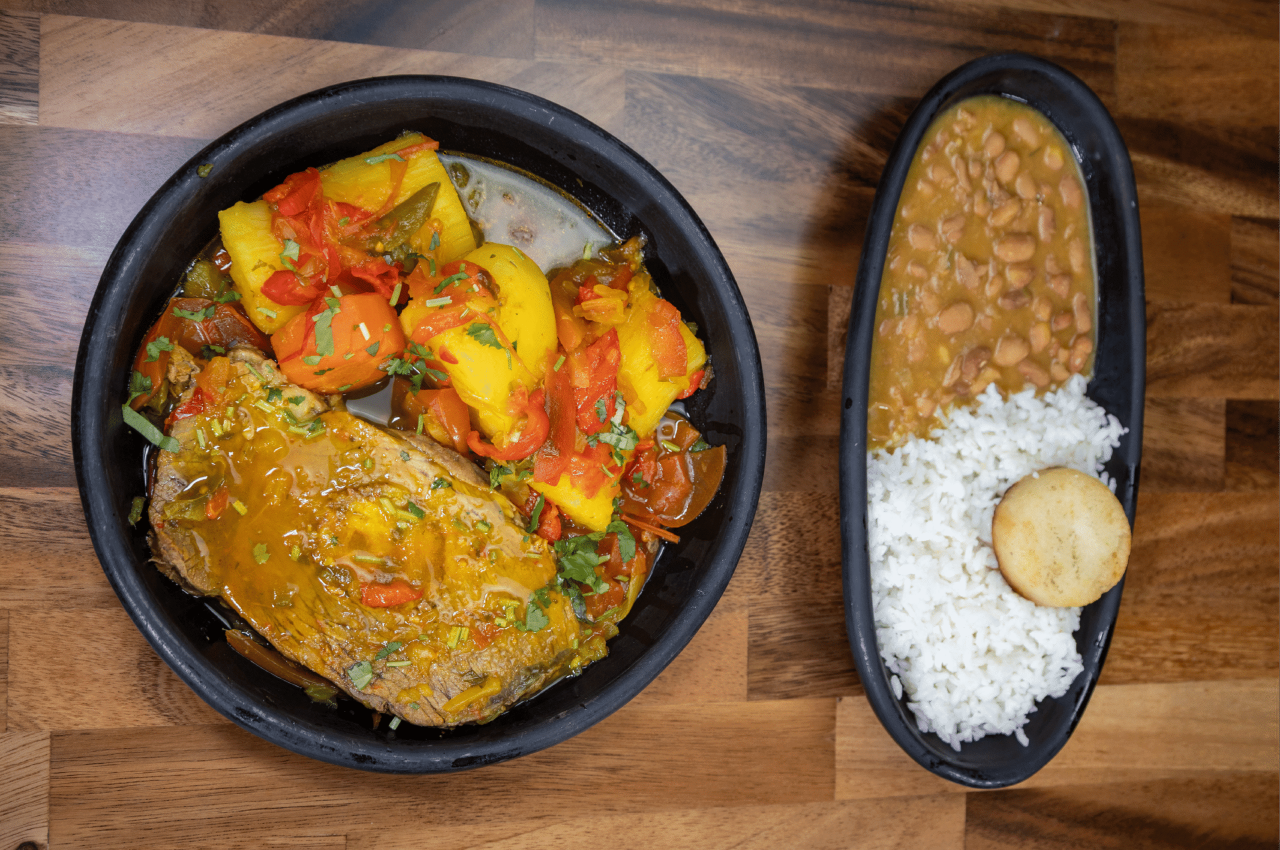 Rice, beans, grilled steak, sweet plantains, crispy pork belly, egg & corn cake