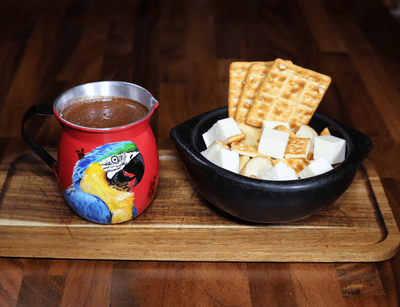 Chocolate, colombian cheese, ducales crackers, buñuelo, cheese bread, toasted bread
